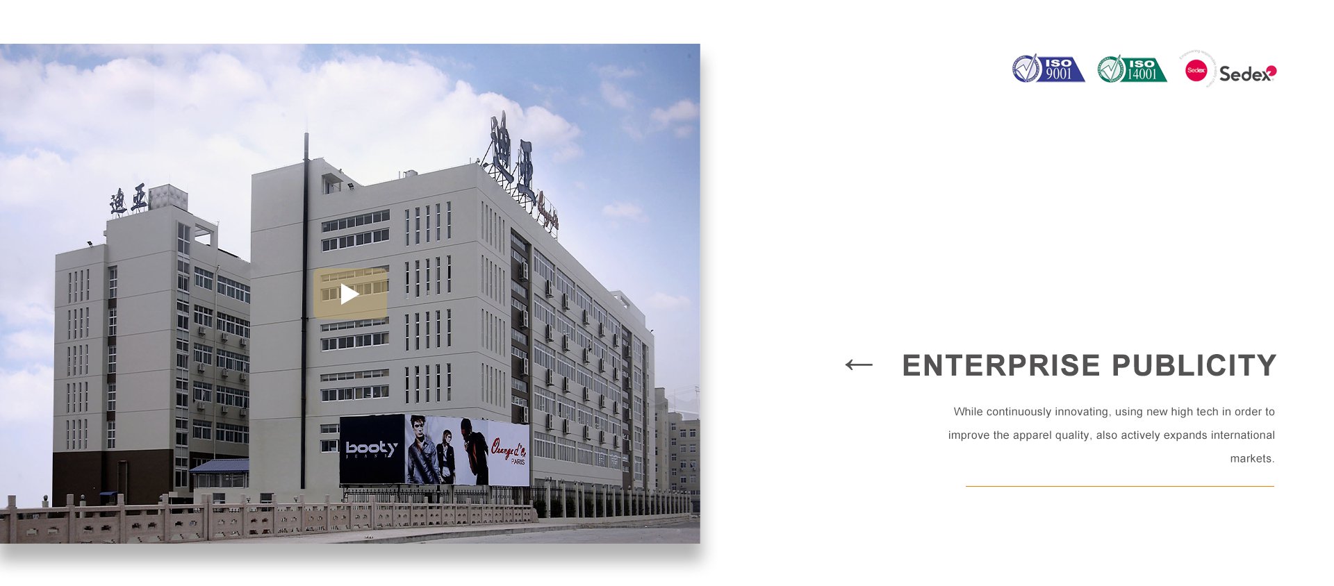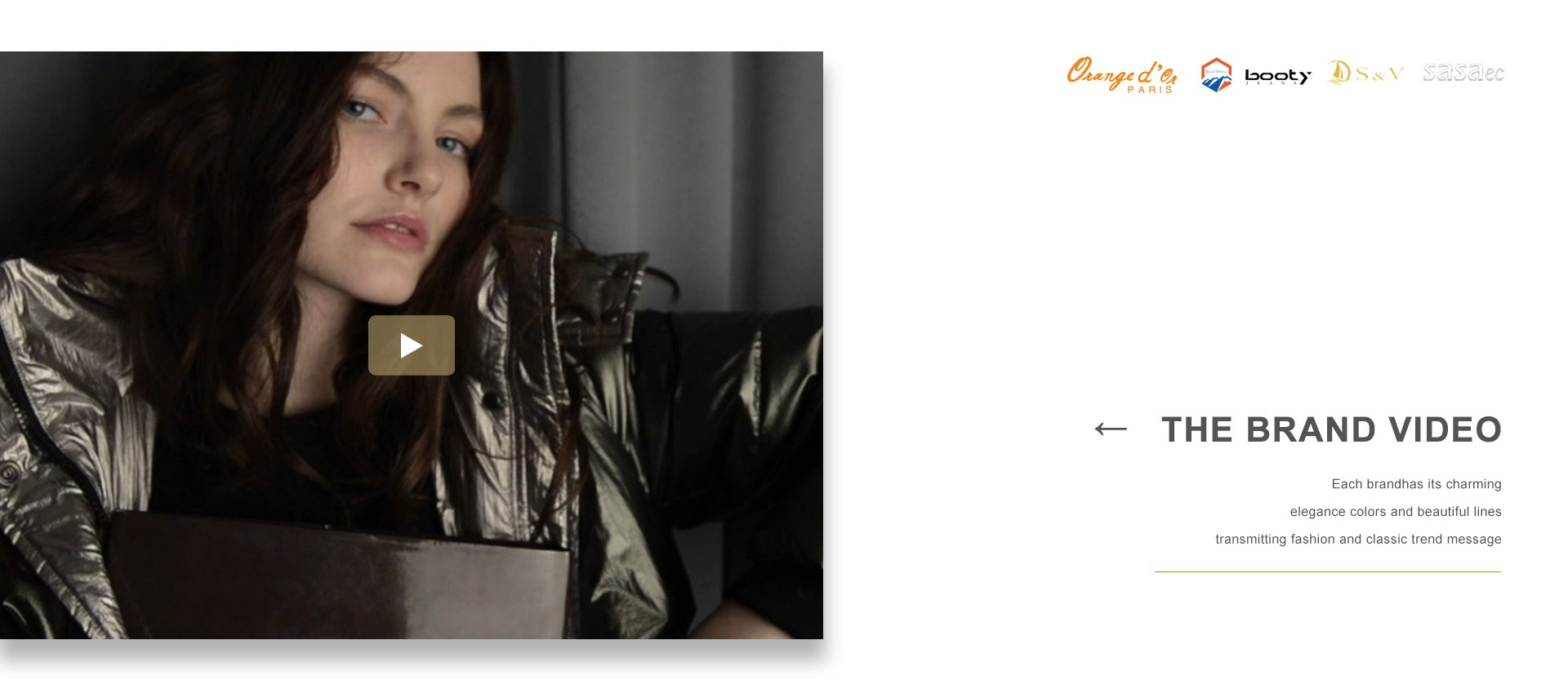 品牌建設(shè)是公司堅(jiān)持不懈的追求,我們每年都會(huì)積極參加國(guó)內(nèi)外舉辦的各大服裝展銷(xiāo)會(huì)。憑借著良好的質(zhì)量與信譽(yù),市場(chǎng)占有率在逐漸擴(kuò)大,產(chǎn)品遠(yuǎn)銷(xiāo)歐洲、美洲、亞洲等國(guó)。公司以生產(chǎn)棉衣、羽絨服、派克、大衣、夾克、運(yùn)動(dòng)休閑服飾等為主,旗下主打品牌有 ORANGE D’OR 、CLAIRVAL、BOOTY JEANS 、S&V和SASAEC,各品牌服飾均以典雅的色彩、優(yōu)美的線條、卓越的魅力吸引著都市麗人,將時(shí)尚、經(jīng)典的潮流信息予以淋漓盡致的演繹。